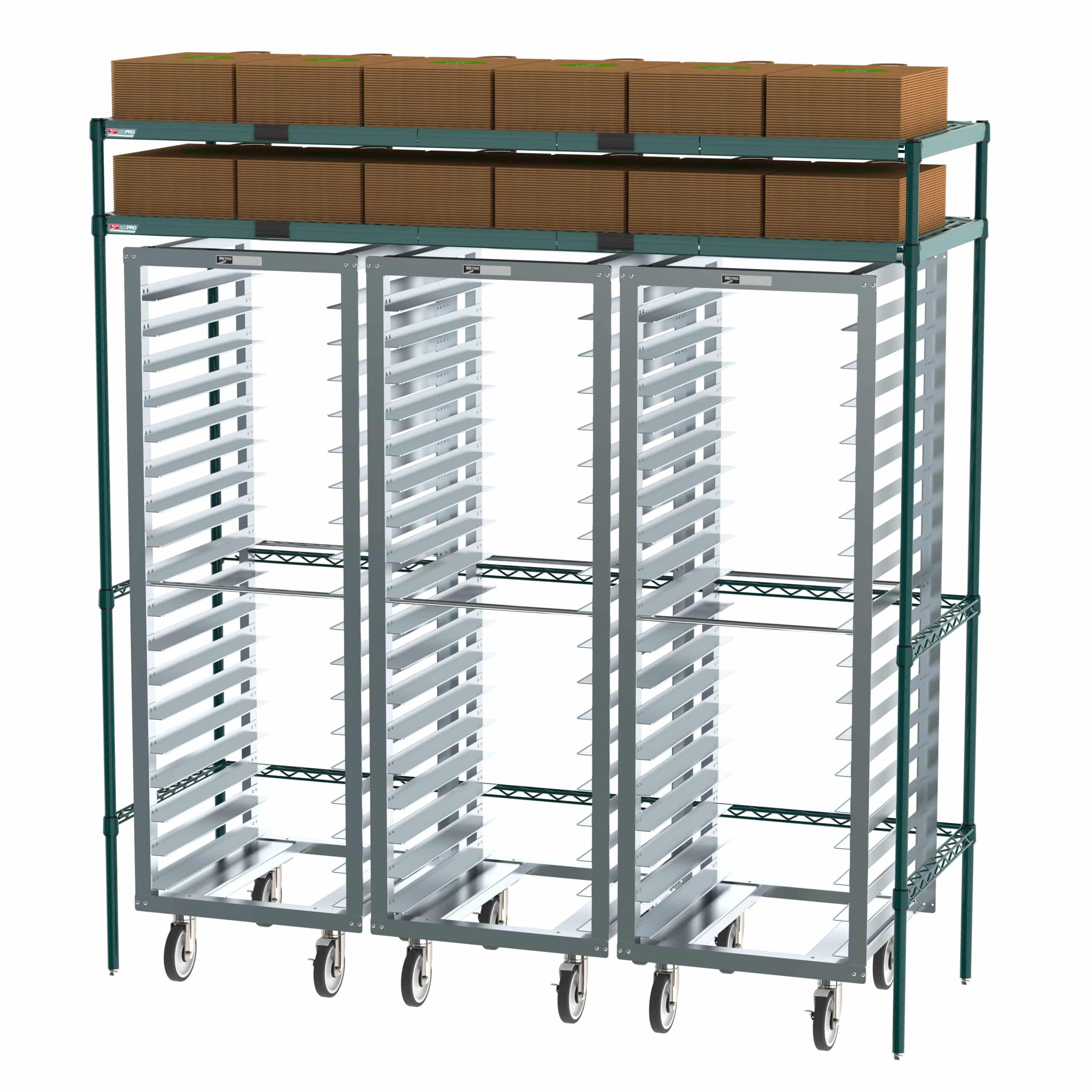Ensure that vertical storage space is being utilized to its full capacity with Metro Docking Stations. Conveniently nest various items under the open storage area to have easy access to them. Overhead Super Erecta Pro Shelves have easy-to-clean removeable polymer mats that can be removed in sections during cleaning without having to unload all the contents.