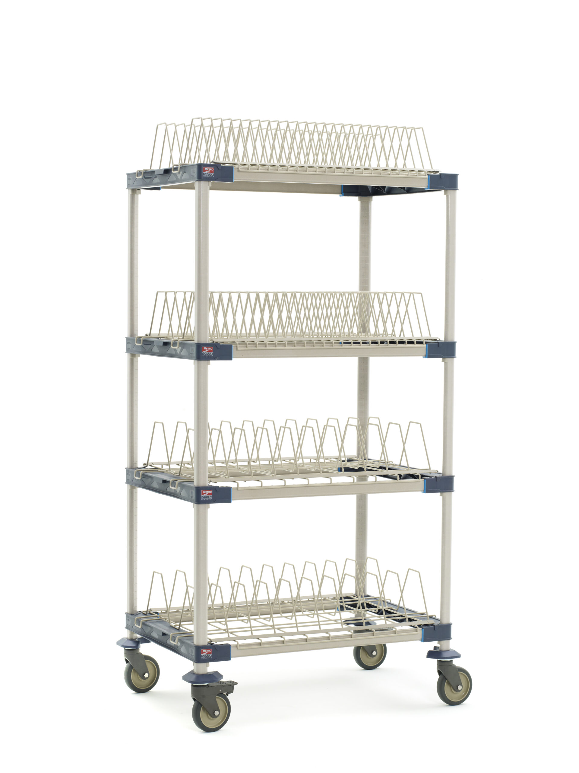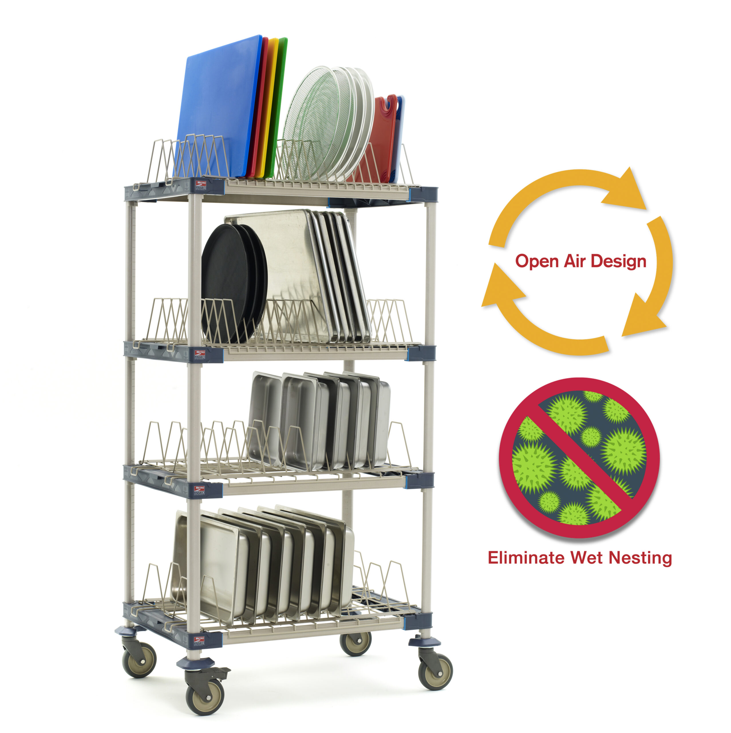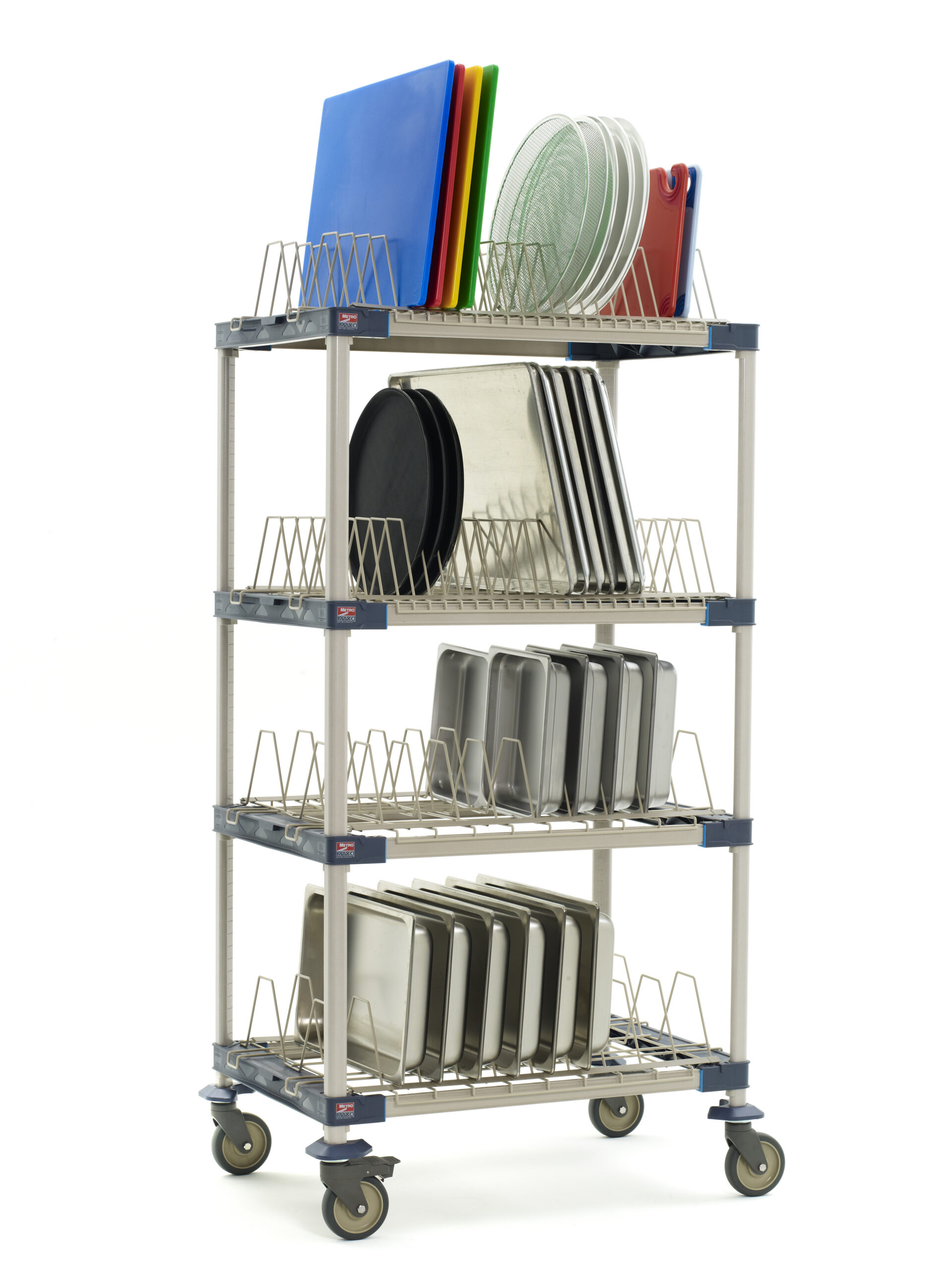 MetroMax 4 Drying Racks combine the corrosion protection and strength of MetroMax 4 with the convenience of a drying rack unit that efficiently sorts and holds pots, pans and trays while they dry to prevent wet nesting. Superior air circulation promotes fast drying of trays, cutting boards, pans, lids, pots and all sink items. Includes (4) MetroMax 4 shelf frames, (4) 63″ (1600mm) mobile posts, (4) corrosion resistant polymer horn casters (two swivel, two brake), (2) tray racks, and (2) steam pan racks.
