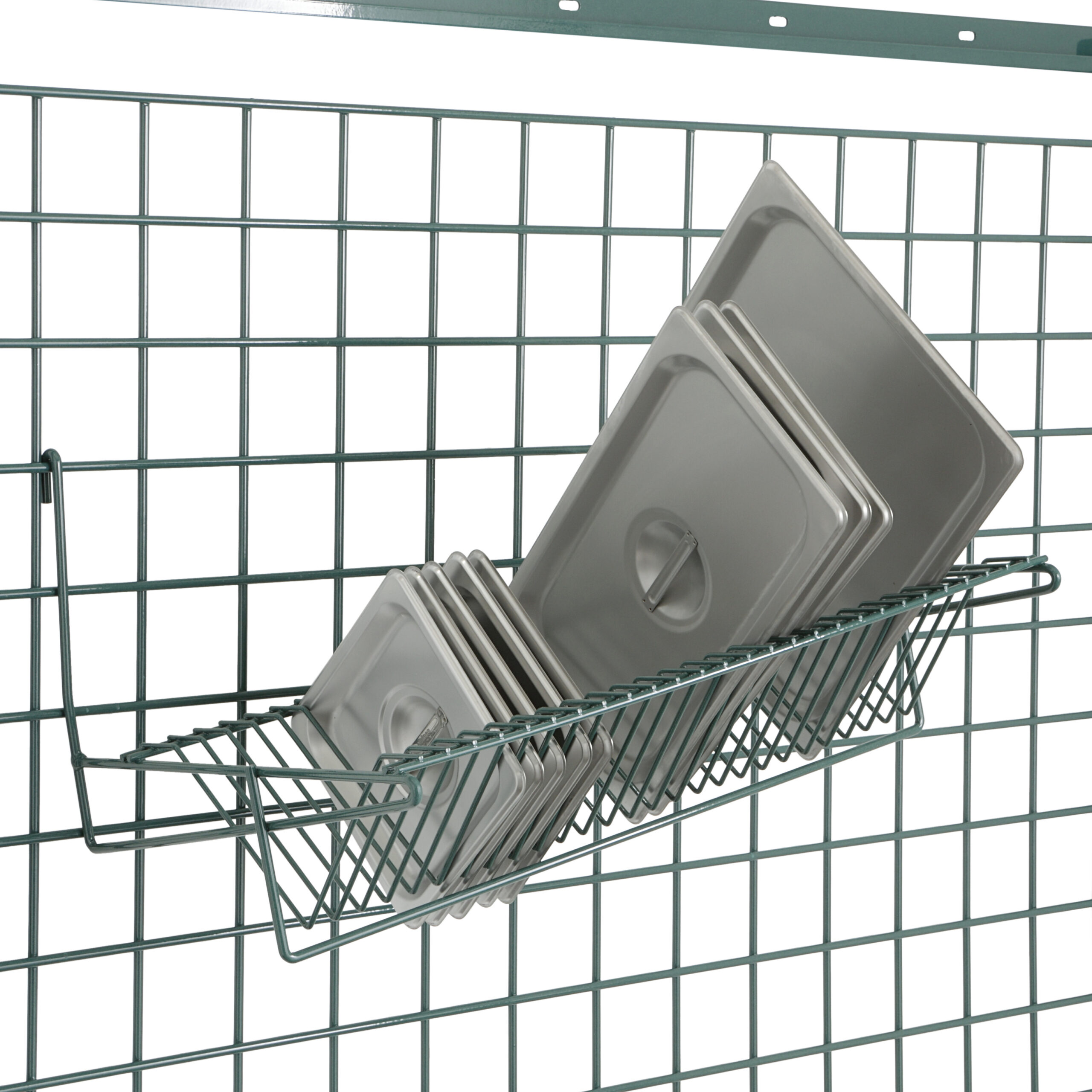 The Slanted Lid Holder/Drying Shelf attaches to Metro SmartWall wire grids and is the perfect solution storing and drying larger lids and dishes. Metroseal finish is suitable for wet and damp enviroments and includes Microban antimicrobial product protection to inhibit the growth of bacteria, mold, mildew, and fungus that cause odors and product degradation.